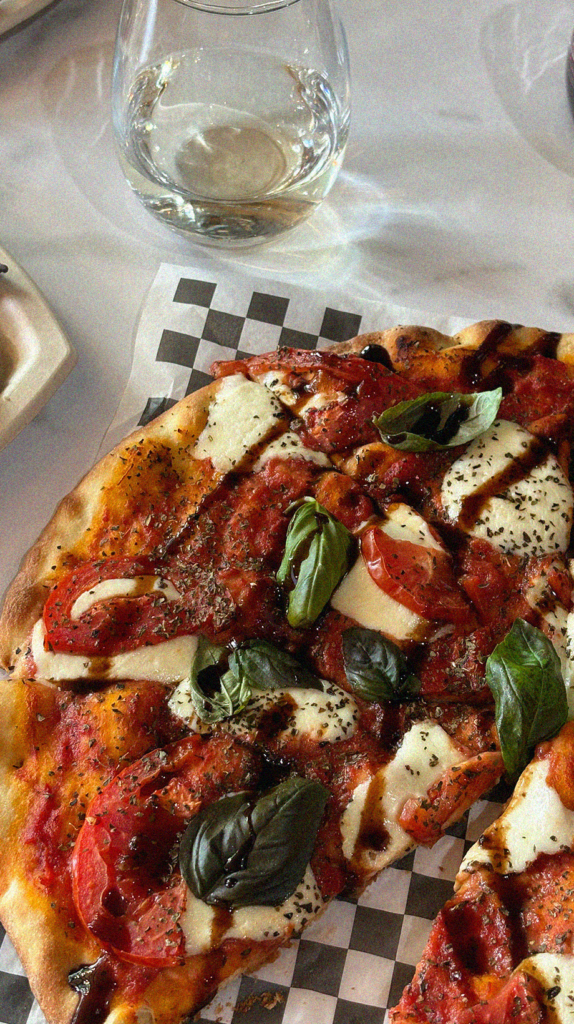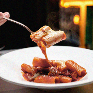 Pasta cooked in a slow-simmered sausage and pepper ragù, folded with English peas and a tomato–basil cream, finished with fresh ricotta.